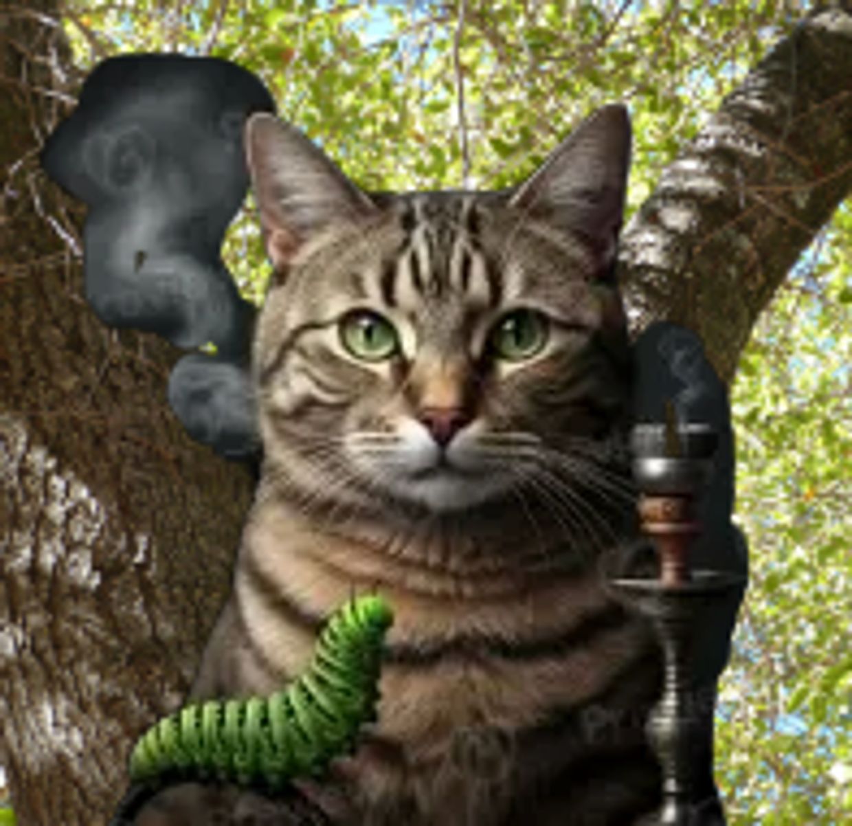 The Chemire Cat sat with the caterpillar and spat the hookah fat.