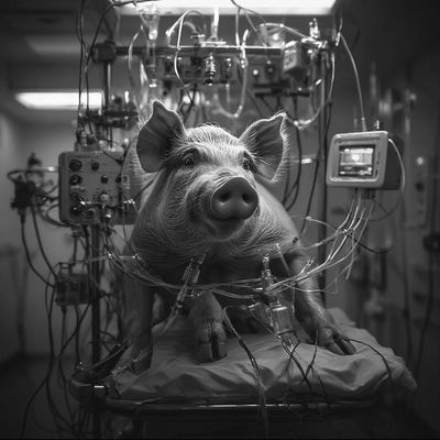 In the farmhouse there were sharp blades and things swinging everywhere. And there were dead pigs' bodies all around and it smelled terrible. It smelled so strong it made me want to barf but I only snorted. There was blood everywhere and it was drying and some of it looked like it was disappearing. The blades made swoosh noises and it was scary but I only snorted some more. The man with the glewing eyes said he was going to kill me first I was such a loud fucking pig. The f-word was bad I said it was bad but it only came out in a weak snort. I didn't want to snort anymore I knew it was bad. The pig beside me was quiet the whole way.